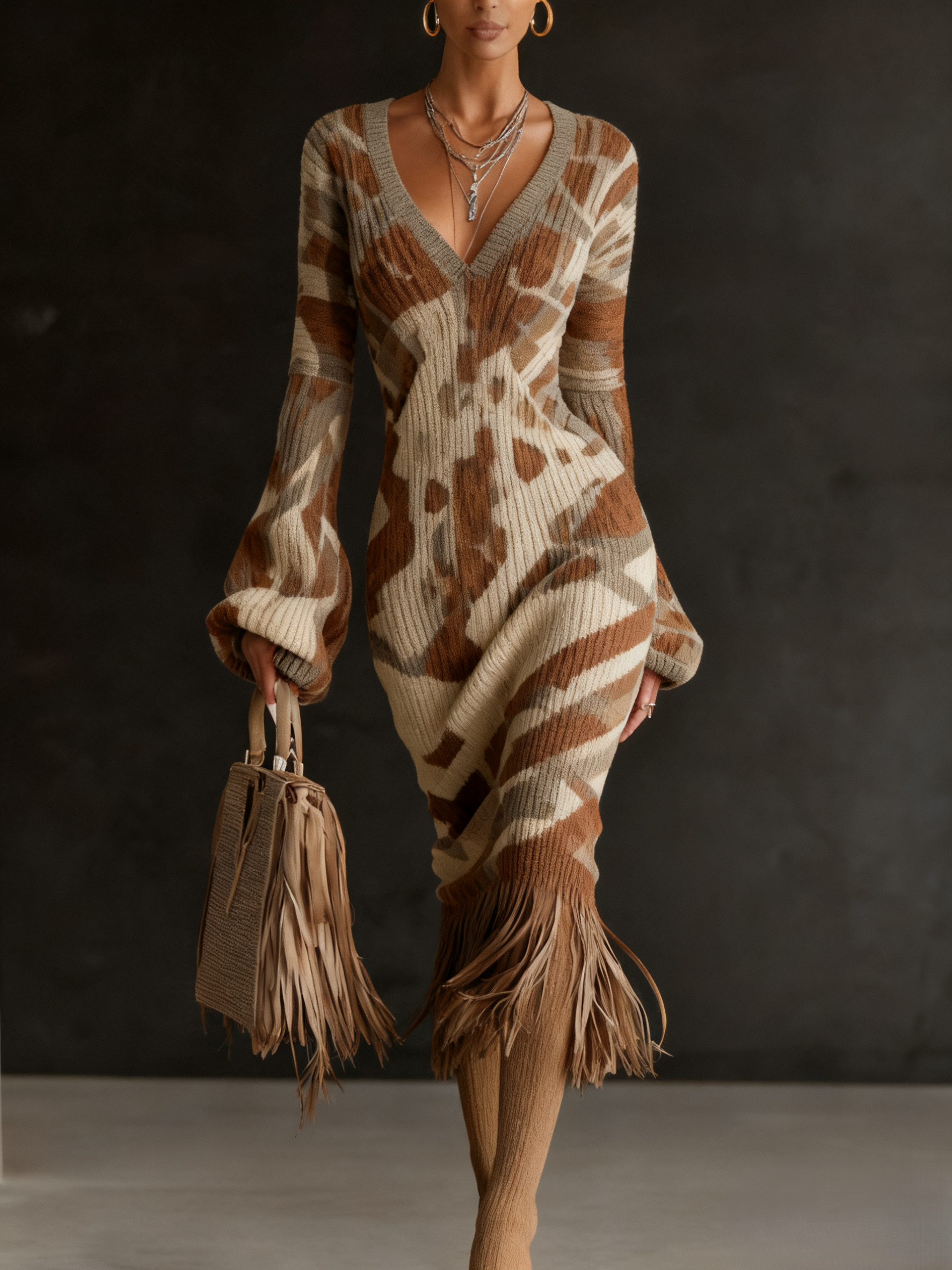 Beige Brown Camouflage Print Fringe Hem Midi Knit Dress