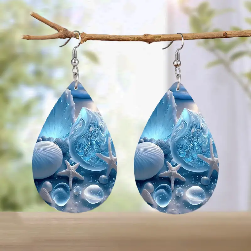 Droplet Shape Fantasy Blue Shell Starfish Pattern Dangle Earrings