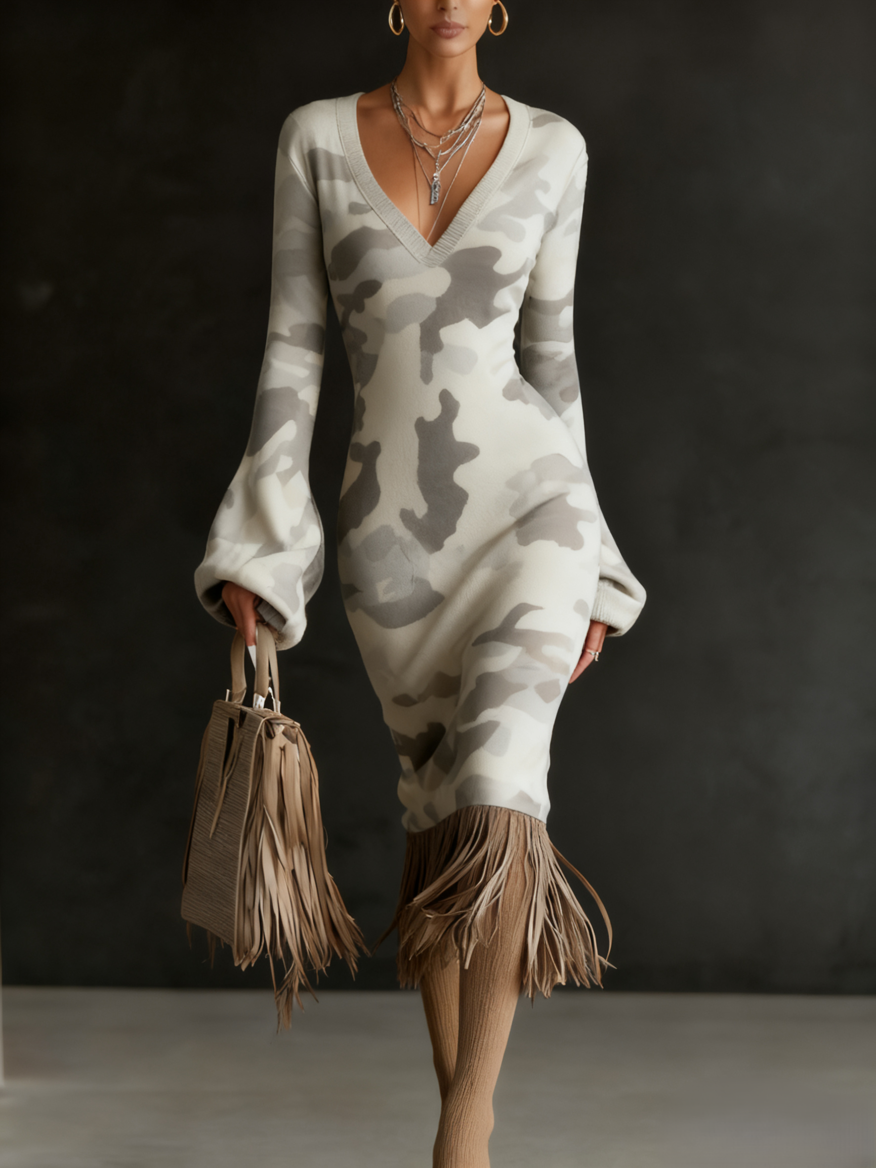 Gray Camouflage Print Fringe Hem Midi Knit Dress
