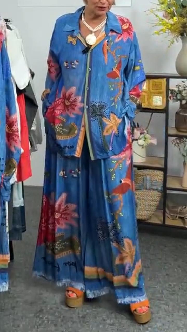 Embrace Artistic Boho Flair: Blue Floral Print Two - Piece Set
