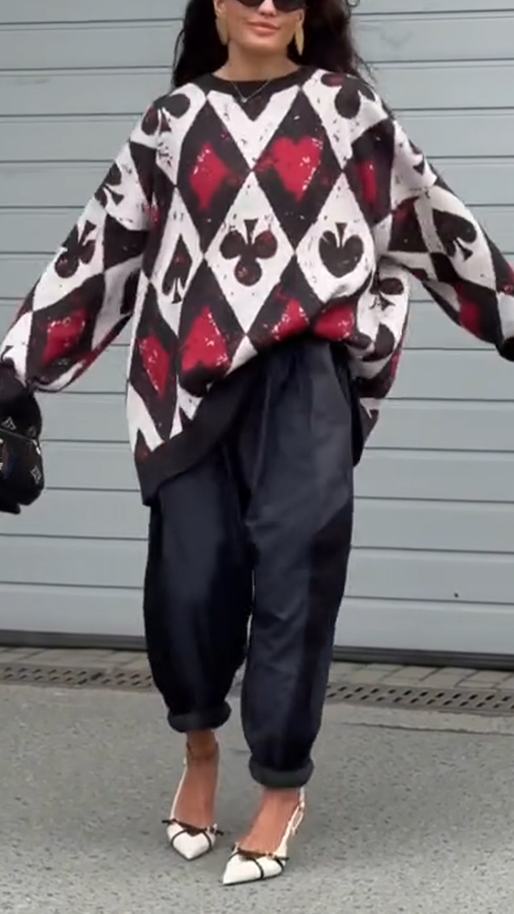 This poker - inspired sweater is a styling gem. Pair it with rolled - up dark denim pants and elegant pointed - toe heels (just like in the picture!) for a trendy, yet sophisticated look that's perfect for a night out at a casual bar or a dinner date. Dress it down with leggings and sneakers for a cozy, athleisure outfit that's ideal for running errands or a relaxed day at home. You can also accessorize it with statement jewelry, like bold gold earrings or a chunky bracelet, to elevate the look further. Additionally, layer it under a leather jacket for an edgier twist during cooler evenings.