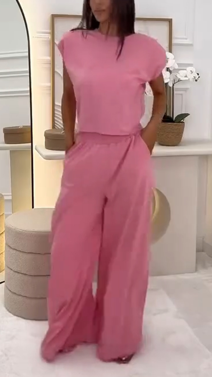 Embrace Sweet Elegance: Pink Cap - Sleeve & Wide - Leg Pants Set