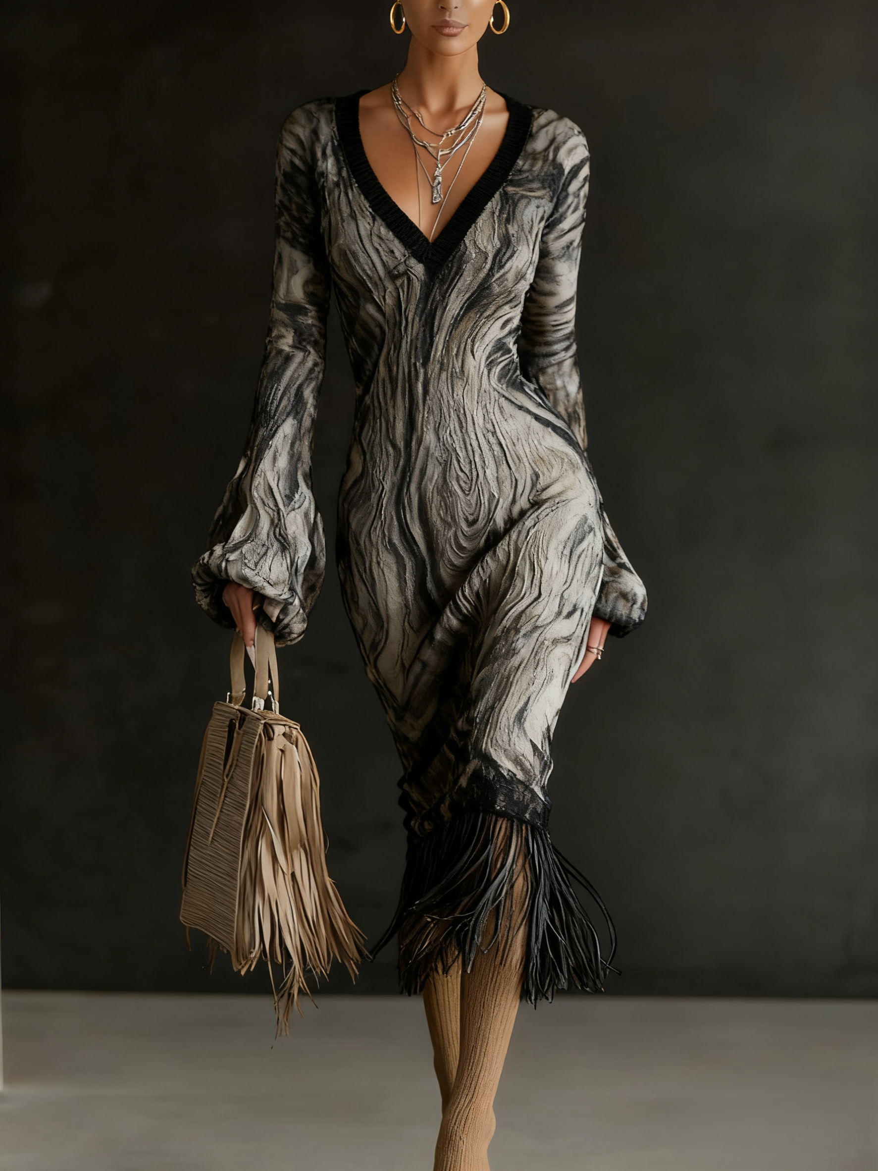 Marble Wood Grain Print Fringe Hem Midi Knit Dress