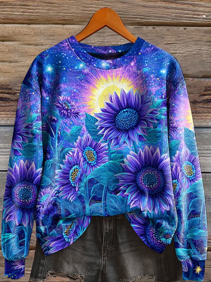 Women'S Casual Blue and Purple Floral Print Sweatshirt