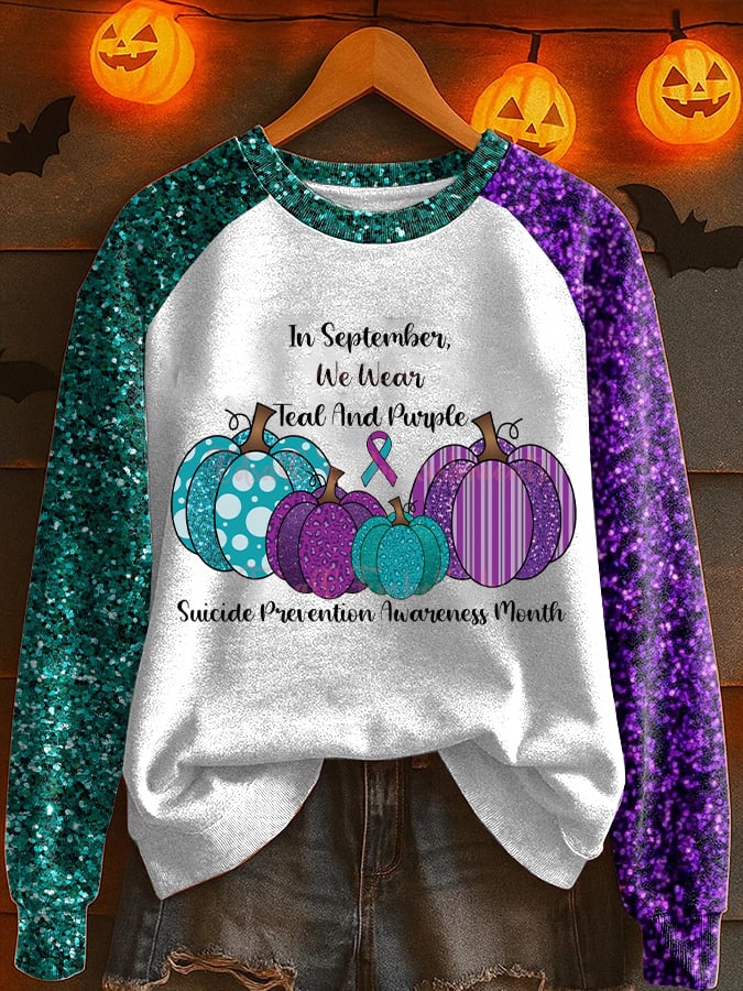 Women's In September We Wear Teal And Purple Suicide Prevention Awareness Print Raglan Sleeve Sweatshirt